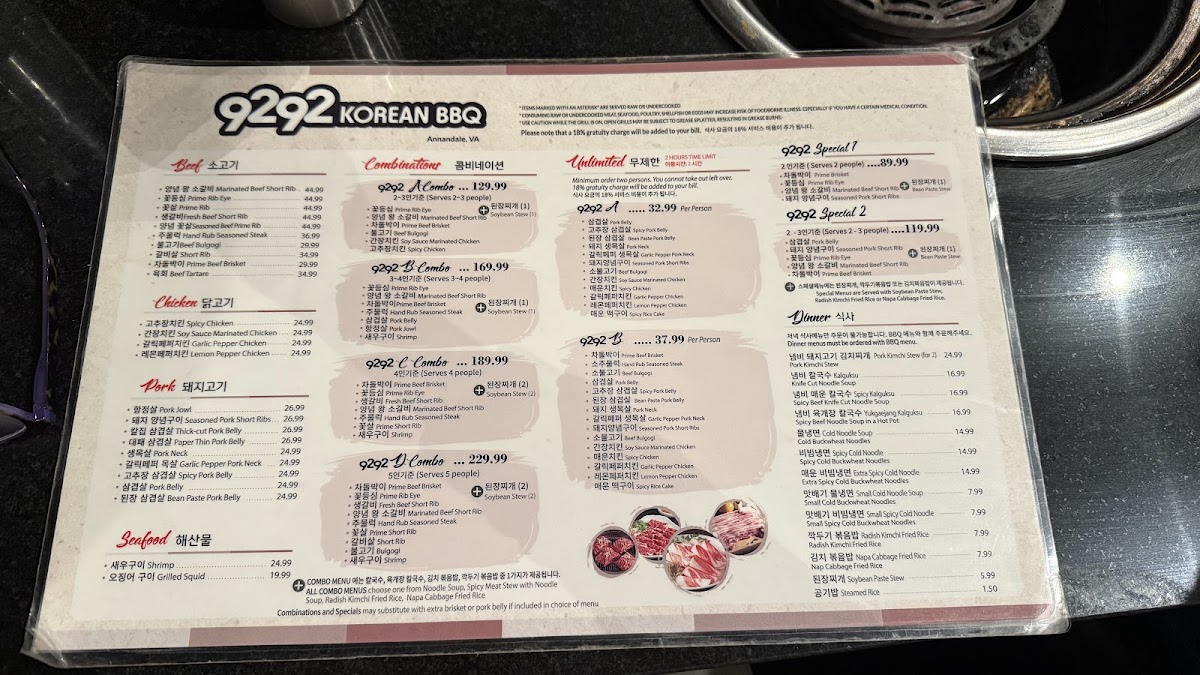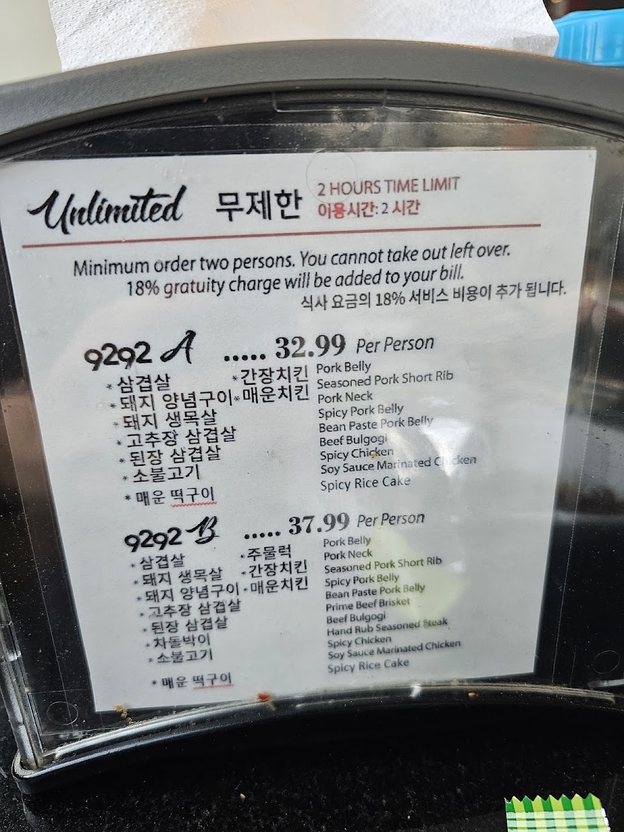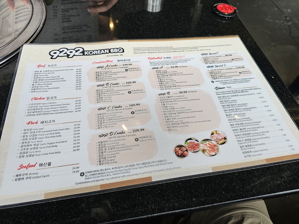 9292 Korean BBQ Menu