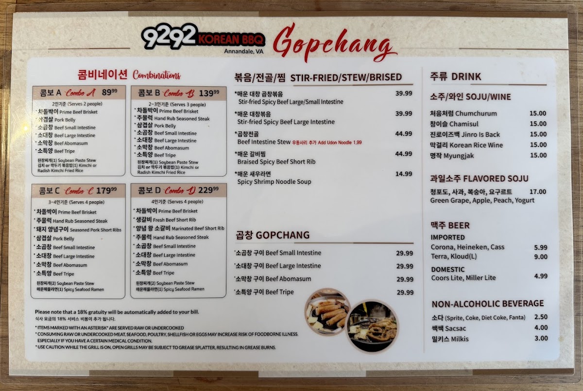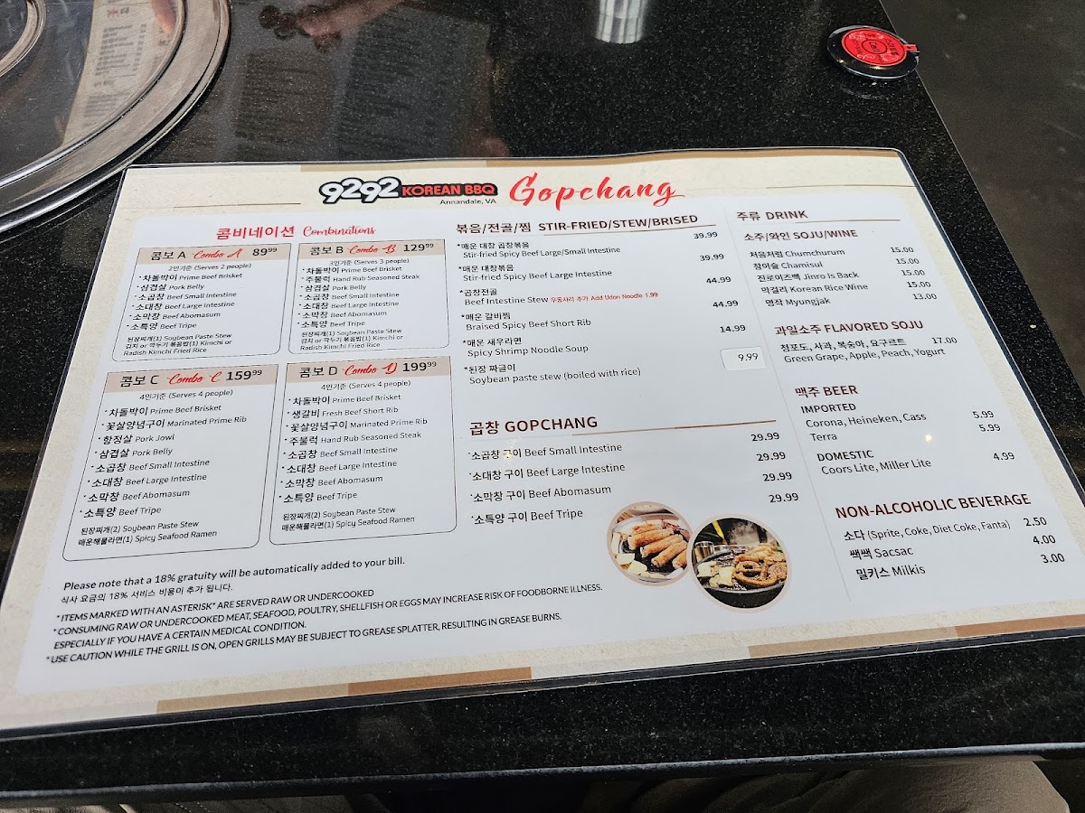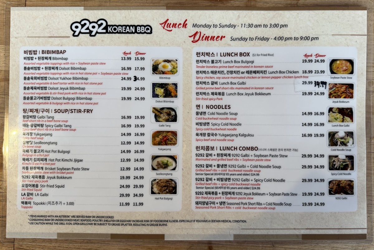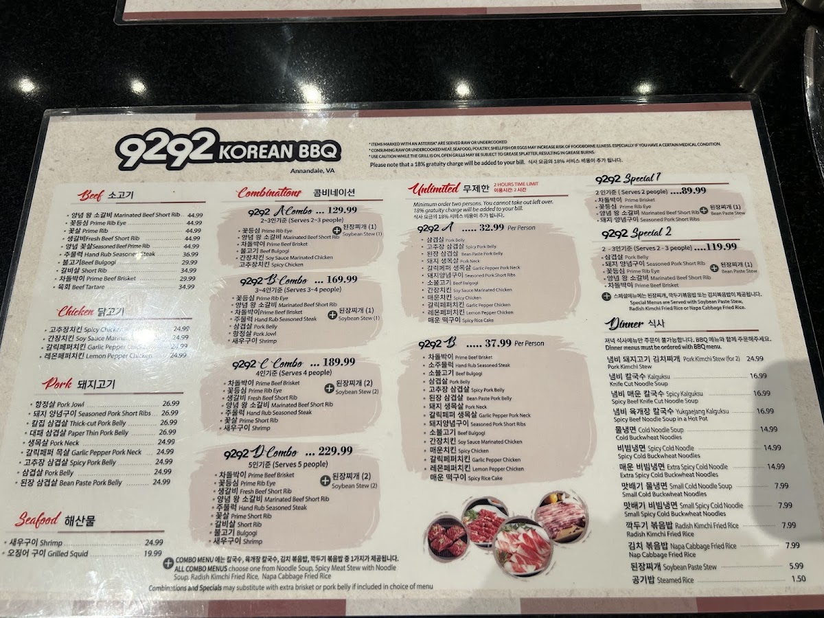9292 Korean BBQ Menu